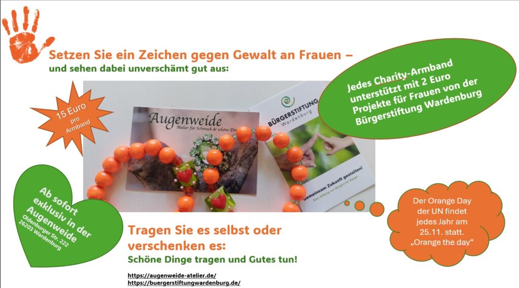 Mit Leila Vogelsang von der Augenweide in Wardenburg haben wir ein Charity-Armband entwickelt, welches ab 11. April 2026 verkauft wird. Jedes orange Armband zeigt: ein Herz für Frauen Projekte, denn 2 Euro vom Verkaufserlös gehen an die Bürgerstiftung für Frauen-Projekte in Wardenburg.